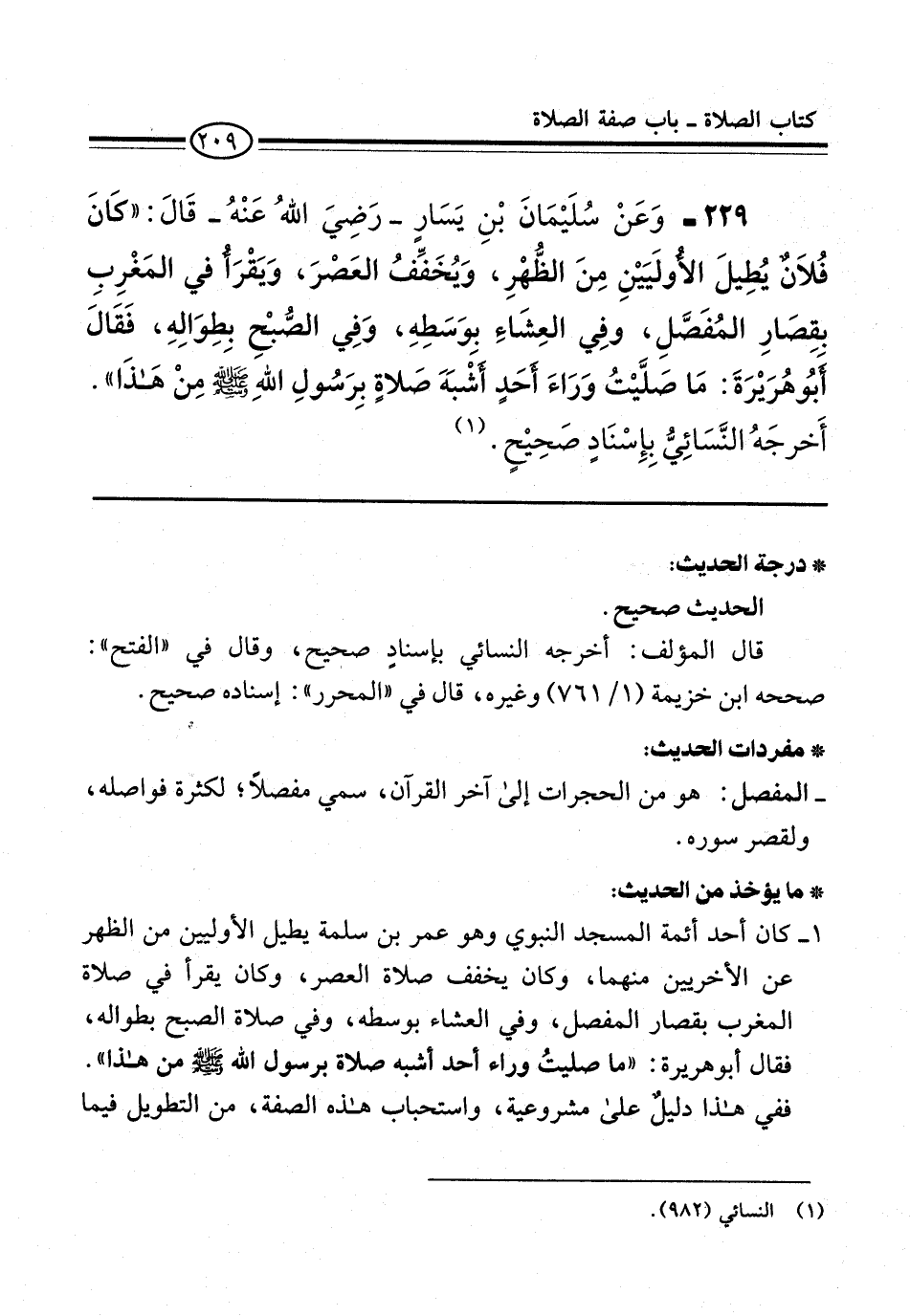 229 - وَعَنْ سُلَيْمَانَ بْنِ يَسَارٍ -رَضِيَ اللهُ عَنْهُ- قَالَ: "كَانَ فُلاَنٌ يُطِيلَ الأُولَيَيْنِ مِنَ الظُّهْرِ، وَيُخَفِّفُ العَصْرَ، وَيَقْرَأُ في المَغْرِبِ بقِصَارِ المُفَصَّلِ، وفِي العِشَاءِ بوَسَطِهِ، وَفِي الصُّبح بِطِوَالِهِ، فَقَالَ أَبُو هُرَيْرَةَ: مَا صَلَّيْتُ وَرَاءَ أحَدٍ أَشْبَهَ صَلاةٍ بِرَسُولِ اللهِ -صلى الله عليه وسلم- مِنْ هَذَا". أَخرجَهُ النَّسَائِيُّ بِإِسْنَادٍ صَحِيْحٍ. (¬1)
