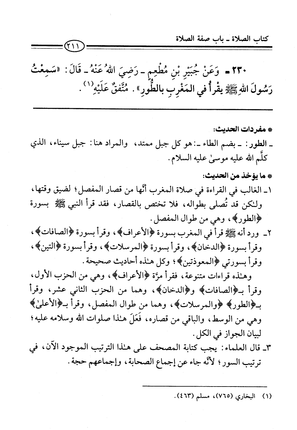 230 - وَعَنْ جُبَيْرِ بْنِ مُطْعِمٍ -رَضِيَ اللهُ عَنْهُ- قَالَ: "سَمِعْتُ رَسُولَ اللهِ -صلى الله عليه وسلم- يقْرأُ في المَغْرِبِ بالطُّورِ". مُتَّفقٌ عَلَيْهِ (¬1).