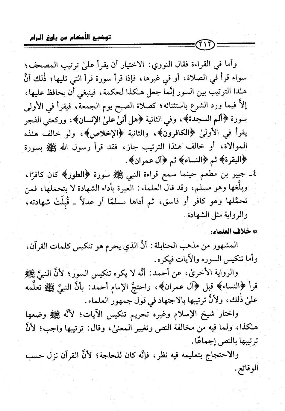 والرواية الأخرى، عن أحمد: أنَّه لا يكره تنكيس السورة لأنَّ النبيَّ -صلى الله عليه وسلم- قرأ {النساء} قبل {آل عمران}، واحتجَّ الإِمام أحمد: بأنَّ النبيَّ -صلى الله عليه وسلم- تعلَّمه على ذلك، ولأنَّ ترتيبها بالاجتهاد في قول جمهور العلماء.