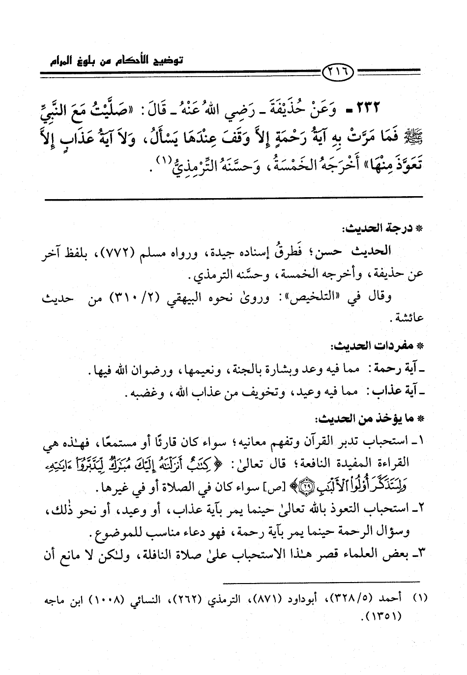 232 - وَعَنْ حُذَيْفَةَ -رَضِي اللهُ عَنْهُ- قَالَ: "صَلَّيْتُ مَعَ النَّبِيِّ -صلى الله عليه وسلم- فمَا مَرَّتْ بِهِ آيَةُ رَحْمَةٍ إلاَّ وَقَفَ عِنْدَها يَسْأَلُ، وَلاَ آيَةُ عَذَابٍ إلاَّ تَعَوَّذَ مِنْهَا" أَخْرَجَهُ الخَمْسَةُ، وَحسَّنَهُ التِّرْمِذِيُّ (¬1).
