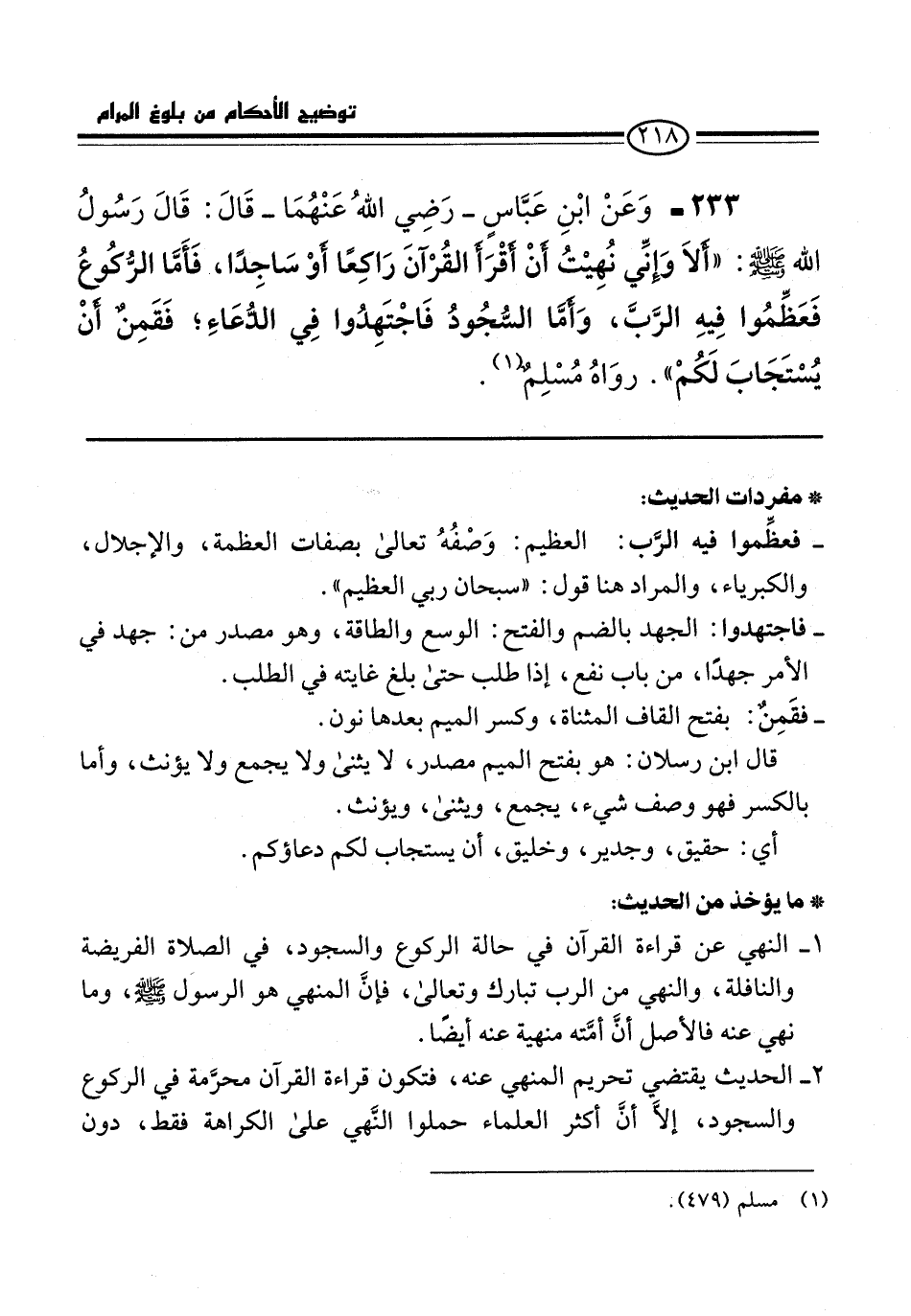 233 - وَعَنْ ابْنِ عَبَّاسٍ -رَضِي اللهُ عَنْهُمَا- قَالَ: قَالَ رَسُولُ الله -صلى الله عليه وسلم-: "ألاَ وَإنِّي نُهِيْتُ أنْ أقْرَأ القُرْآنَ رَاكِعًا أوْ سَاجِدًا، فَأَمَّا الرُّكُوعُ فَعَظِّمُوا فِيهِ الرَّبَّ، وَأَمَّا السُّجُودُ فَاجْتَهِدُوا فِي الدُّعَاءِ؛ فَقَمِنٌ أنْ يُسْتَجَابَ لَكُمْ". روَاهُ مُسْلِمٌ (¬1).