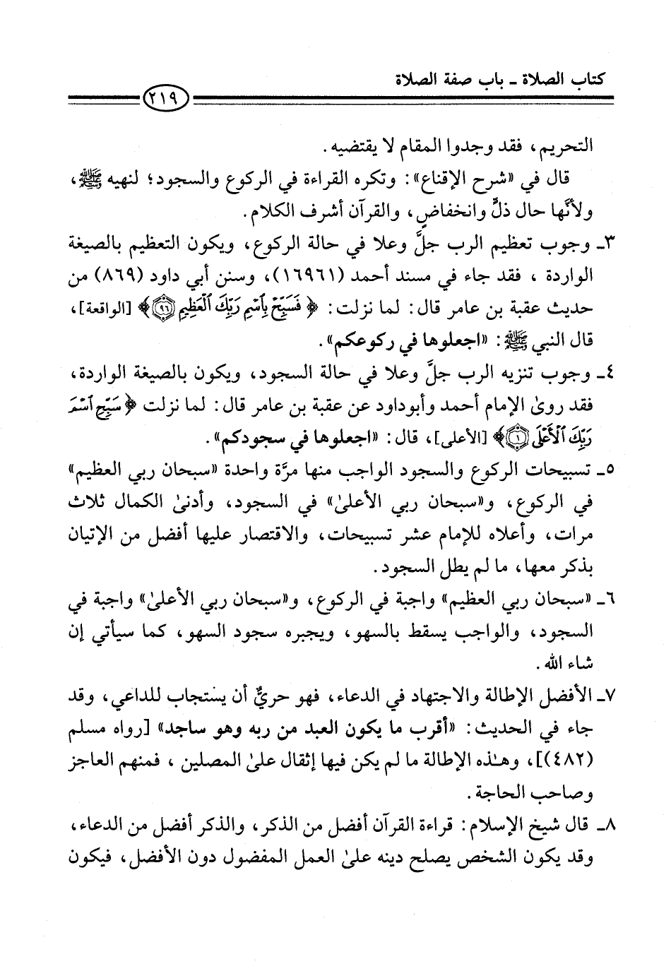 5 - تسبيحات الركوع والسجود الواجب منها مرَّة واحدة "سبحان ربي العظيم" في الركوع، و"سبحان ربي الأعلى" في السجود، وأدنى الكمال ثلاث مرات، وأعلاه للإمام عشر تسبيحات، والاقتصار عليها أفضل من الإتيان بذكر معها، ما لم يطل السجود.