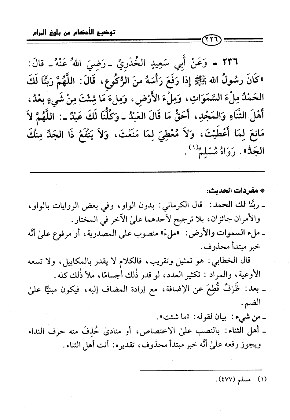 236 - وَعَنْ أَبِي سَعِيدٍ الخُدْرِيِّ -رَضِيَ اللهُ عَنْهُ- قالَ: "كَانَ رسُولُ الله -صلى الله عليه وسلم- إِذا رَفَعَ رَأسَهُ منَ الرُّكُوعِ، قَالَ: اللَّهُمَّ رَبَّنَا لَكَ الحَمْدُ مِلْءَ السَّمَوَاتِ، وَمِلْءَ الأَرْضِ، وَمِلءَ مَا شِئتَ مِنْ شَيءٍ بعْدُ، أهْلَ الثَّنَاءِ وَالمَجْدِ، أحَقُّ مَا قَالَ العَبْدُ -وَكلُّنا لَكَ عَبْدٌ-: اللَّهُمَّ لاَ مَانِعَ لِمَا أعْطَيْتَ، وَلاَ مُعْطِيَ لِمَا مَنَعْتَ، وَلاَ يَنْفَعُ ذَا الجَدِّ مِنْكَ الجَدُّ". رَوَاهُ مُسْلِمٌ (¬1).