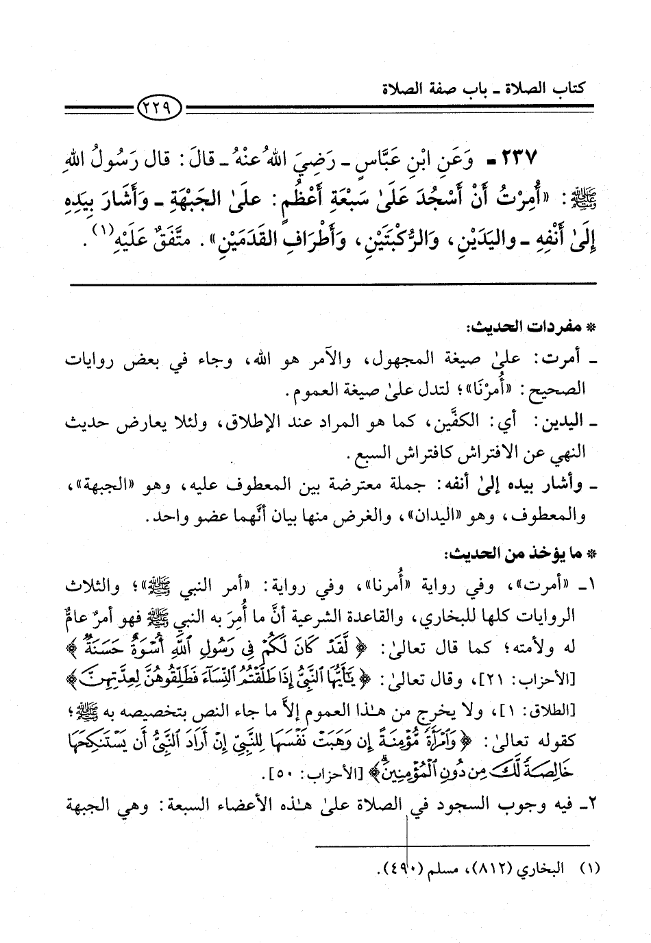237 - وَعَنِ ابْنِ عَبَّاسٍ -رَضِيَ اللهُ عنْهُ- قالَ: قَال رَسُولُ اللهِ -صلى الله عليه وسلم-: "أُمِرْتُ أنْ أَسْجُدَ عَلَى سَبْعَةِ أعْظُمٍ: علَى الجَبْهَةِ -وَأشَارَ بيَدِهِ إِلَى أَنْفِهِ- واليَدَيْنِ، وَالرُّكْبَتَيْنِ، وَأطْرَافِ القَدَمَيْنِ". متَّفَقٌ عَلَيْهِ (¬1).