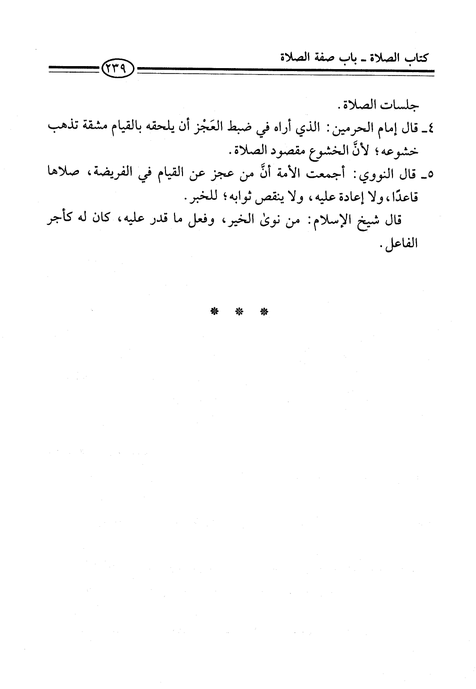 4 - قال إمام الحرمين: الذي أراه في ضبط العَجْز أن يلحقه بالقيام مشقة تذهب خشوعه؛ لأنَّ الخشوع مقصود الصلاة.