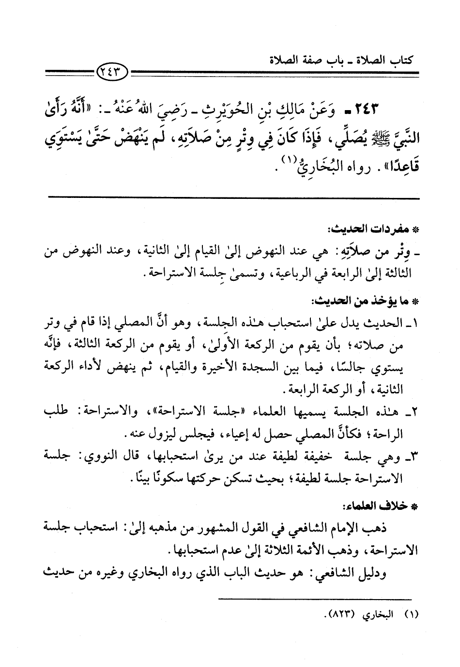 243 - وَعَنْ مَالِكِ بْنِ الحُوَيْرِثِ -رَضِيَ اللهُ عَنْهُ-: "أنَّهُ رَأَى النَّبِيَّ -صلى الله عليه وسلم- يُصَلِّي، فَإِذَا كَانَ فِي وِتْرٍ مِنْ صَلاَتِهِ، لَم يَنْهَضْ حَتَّى يَسْتَوَي قَاعِدًا". رواه البُخَارِيُّ (¬1).