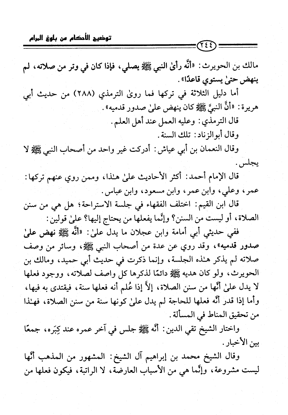 مالك بن الحويرث: "أنَّه رأى النبي -صلى الله عليه وسلم- يصلي، فإذا كان في وتر من صلاته، لم ينهض حتى يستوي قاعدًا".