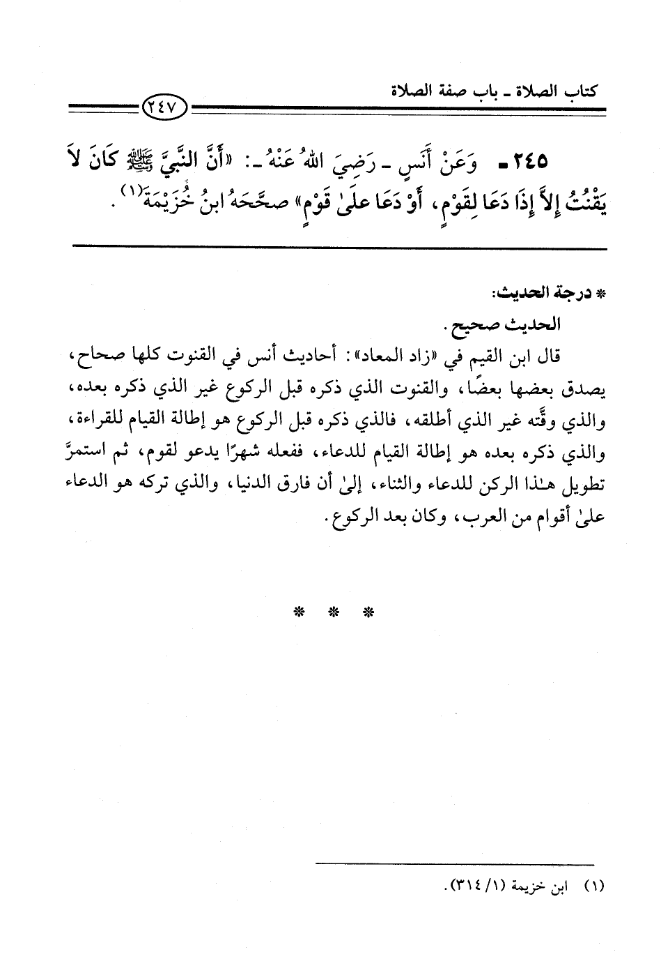 245 - وَعَنْ أَنَسٍ -رَضِيَ اللهُ عَنْهُ-: "أنَّ النَّبيَّ -صلى الله عليه وسلم- كَانَ لاَ يَقْنُتُ إِلاَّ إِذَا دَعَا لِقَوْمٍ، أَوْ دَعَا عَلَى قَوْمٍ" صحَّحَهُ ابنُ خُزَيْمَةَ (¬1).