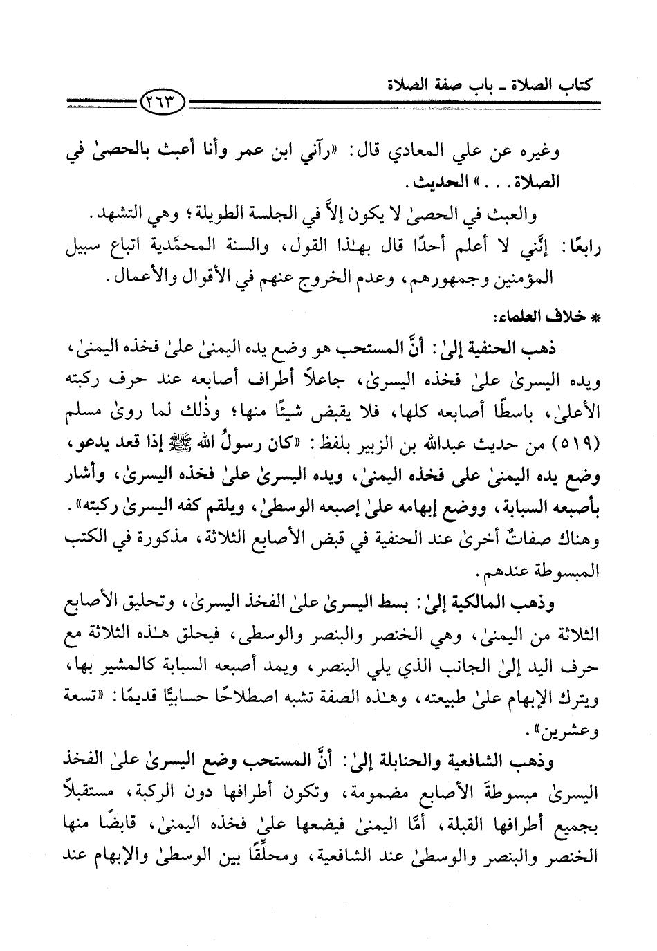 وذهب الشافعية والحنابلة إلى: أنَّ المستحب وضع اليسرى على الفخذ اليسرى مبسوطةَ الأصابع مضمومة، وتكون أطرافها دون الركبة، مستقبلاً بجميع أطرافها القبلة، أمَّا اليمنى فيضعها علي فخذه اليمنى، قابضًا منها الخنصر والبنصر والوسطى عند الشافعية، ومحلِّقًا بين الوسطى والإبهام عند