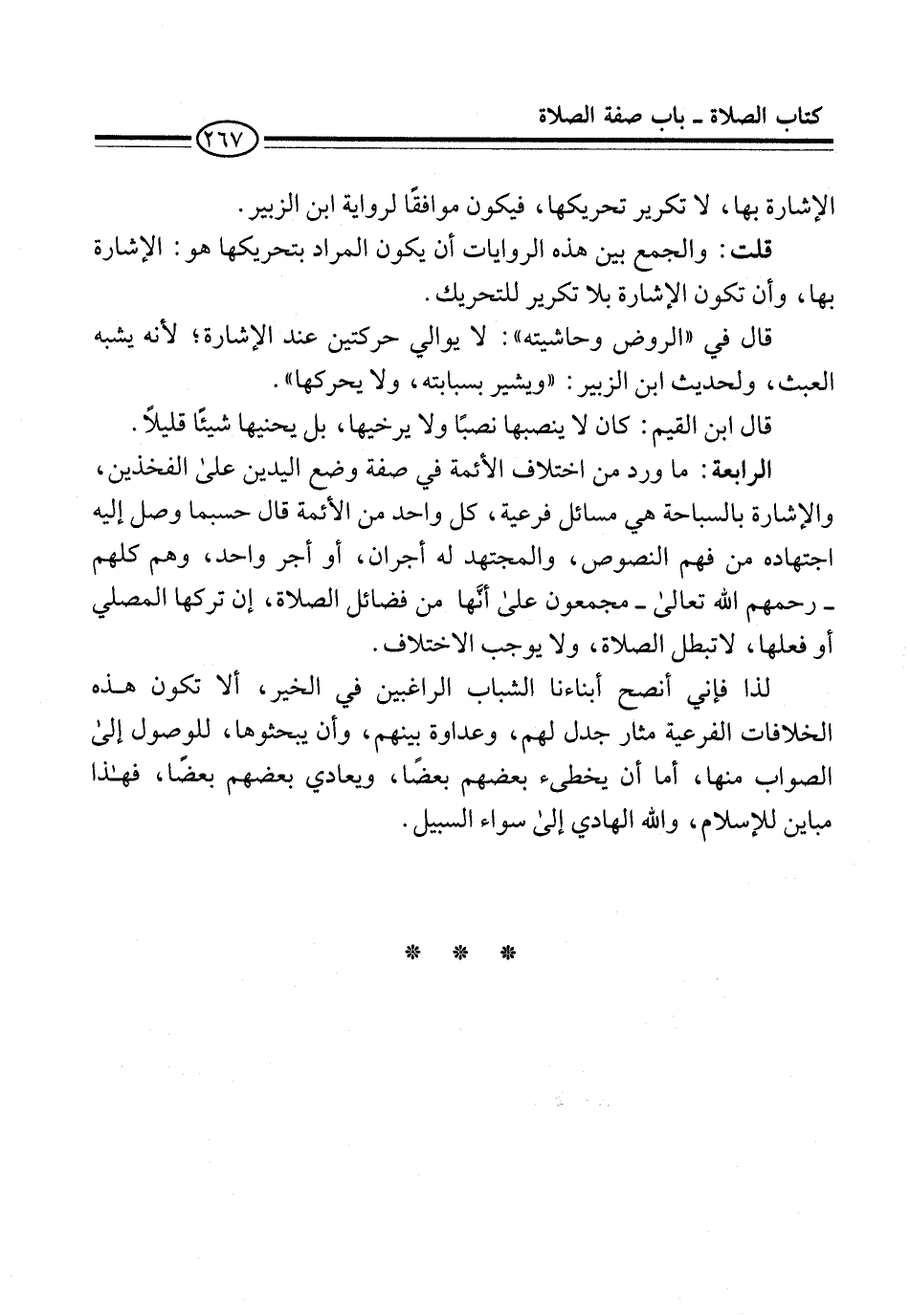 لذا فإني أنصح أبناءنا الشباب الراغبين في الخير، ألا تكون هذه الخلافات الفرعية مثار جدل لهم، وعداوة بينهم، وأن يبحثوها، للوصول إلى الصواب منها، أما أن يخطىء بعضهم بعضًا، ويعادي بعضهم بعضًا، فهذا مباين للإسلام، والله الهادي إلى سواء السبيل.