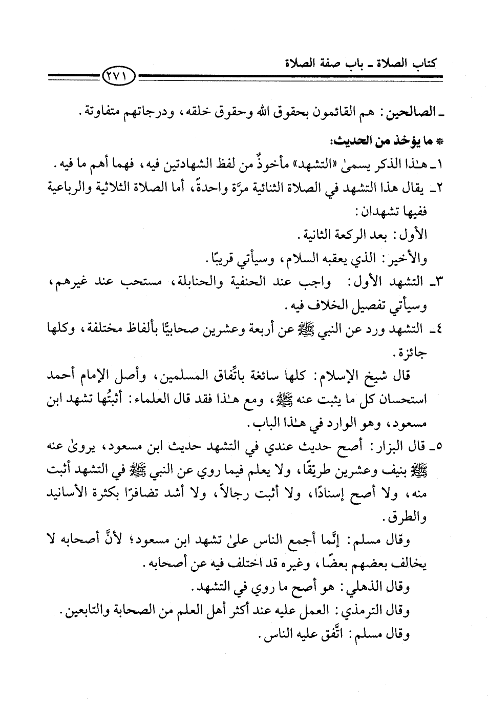 5 - قال البزار: أصح حديث عندي في التشهد حديث ابن مسعود، يروى عنه -صلى الله عليه وسلم- بنيف وعشرين طريْقًا، ولا يعلم فيما روي عن النبي -صلى الله عليه وسلم- في التشهد أثبت منه، ولا أصح إسنادًا، ولا أثبت رجالاً، ولا أشد تضافرًا بكثرة الأسانيد والطرق.