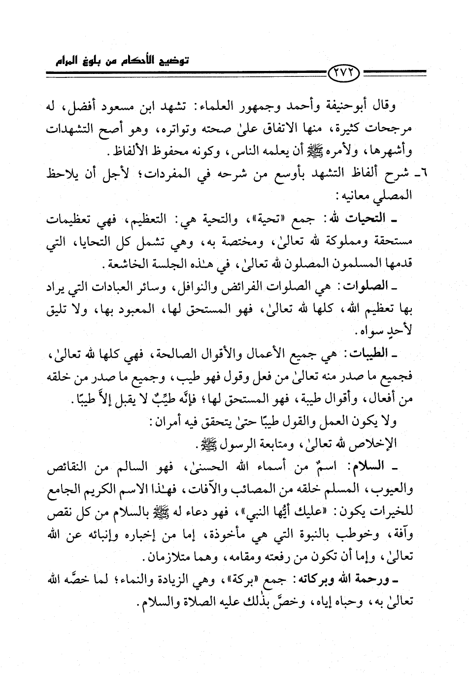 6 - شرح ألفاظ التشهد بأوسع من شرحه في المفردات؛ لأجل أن يلاحظ المصلي معانيه:
