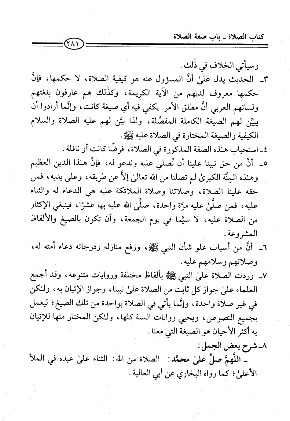 3 - الحديث يدل على أنَّ المسؤول عنه هو كيفية الصلاة، لا حكمها، فإنَّ حكمها معروف لديهم من الآية الكريمة، وكذلك هم عارفون بلغتهم ولسانهم العربي أنَّ مطلق الأمر يكفي فيه أي صيغة كانت، وإنَّما أرادوا أن يبيِّن لهم الصيغة الكاملة المفصَّلة، ولذا بيَّن لهم عليه الصلاة والسلام الكيفية والصيغة المختارة في الصلاة -صلى الله عليه وسلم-.