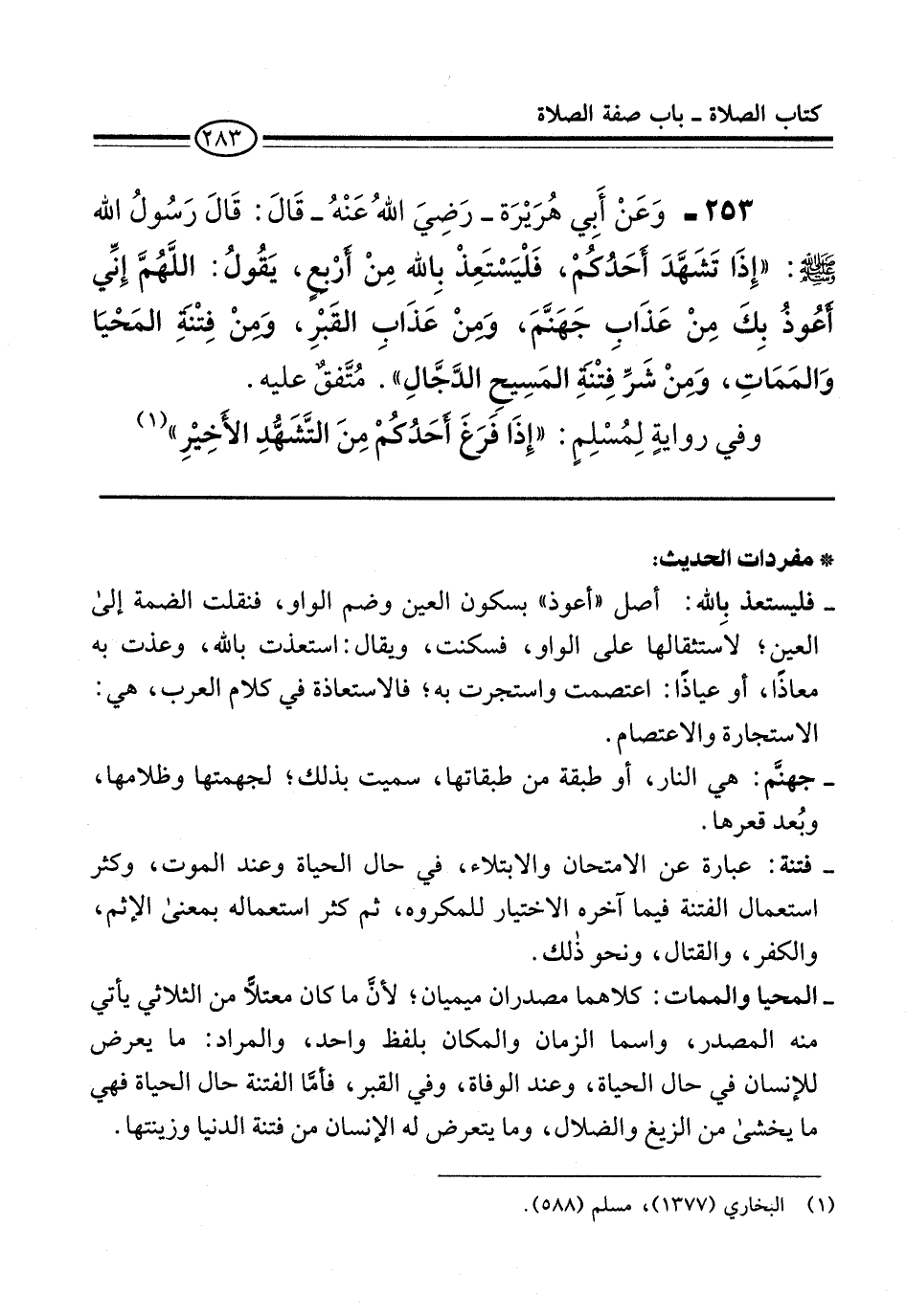 253 - وَعَنْ أَبِي هُرَيْرَة -رَضِيَ اللهُ عَنْهُ- قَالَ: قَالَ رَسُولُ الله -صلى الله عليه وسلم-: "إِذَا تَشَهَّدَ أحَدُكُمْ، فَلْيَسْتَعِذْ بِالله مِنْ أرْبعٍ، يَقُولُ: اللَّهُمَّ إِنِّي أعُوذُ بِكَ مِنْ عَذَابِ جَهَنَّمَ، وَمِنْ عَذَابِ القَبْرِ، وَمنْ فِتْنَةِ المَحْيَا وَالمَمَاتِ، وَمِنْ شَرِّ فِتْنهِ المَسِيح الدَّجَّالِ". مُتَّفقٌ عليه.