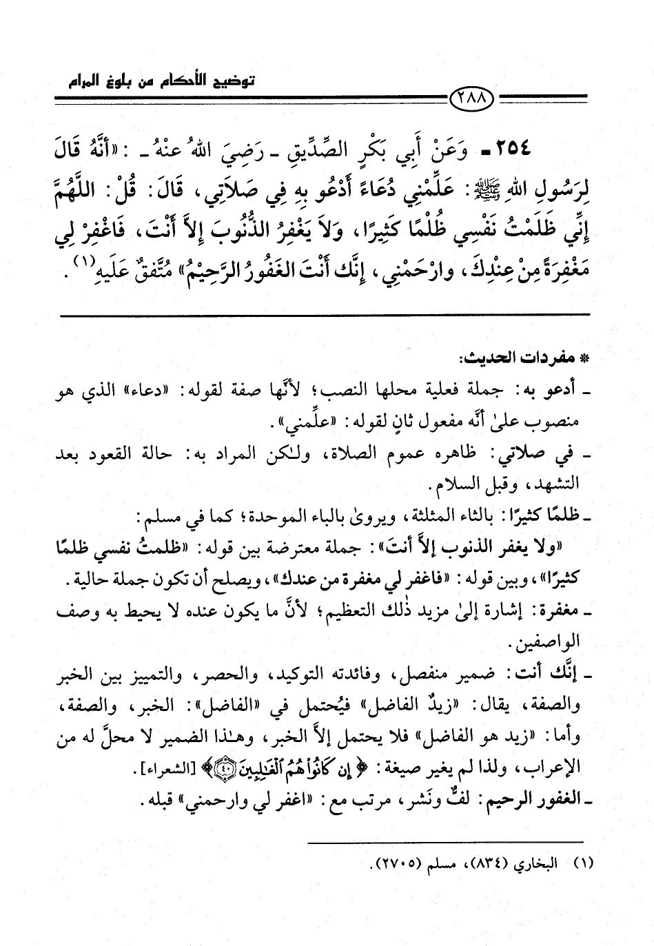 254 - وَعَنْ أَبِي بَكْرٍ الصِّدِّيقِ -رَضِيَ اللهُ عنْهُ-: "أنَّهُ قَالَ لِرَسُولِ الله -صلى الله عليه وسلم-: عَلِّمْنِي دُعَاءً أَدْعُو بِهِ فِي صَلاَتِي، قَالَ: قُلْ: اللَّهُمَّ إِنِّي ظَلَمْتُ نَفْسِي ظُلْمًا كثَيِرًا، وَلاَ يَغْفِرُ الذُّنُوبَ إِلاَّ أنْتَ، فَاغْفِرْ لِي مَغْفِرَةً مِنْ عِنْدِكَ، وارْحَمْنِي، إِنَّك أنْتَ الغَفُورُ الرَّحِيْمُ" مُتَّفقٌ عَلَيهِ (¬1).