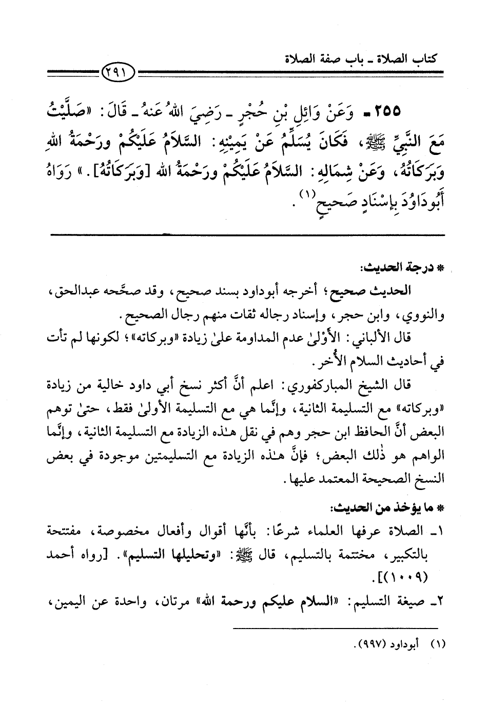 255 - وَعَنْ وَائِلِ بْنِ حُجْرٍ -رَضِيَ اللهُ عَنهُ- قَالَ: "صَلَّيْتُ مَعَ النَّبِيِّ -صلى الله عليه وسلم-، فَكَانَ يُسَلِّمُ عَنْ يَمِيْنِهِ: السَّلاَمُ عَلَيْكُمْ ورَحْمَةُ اللهِ وَبركَاتُهُ، وَعَنْ شِمَالِهِ: السَّلاَمُ عَلَيْكُمْ ورَحْمَةُ الله [وَبركَاتُهُ] ". رَوَاهُ أَبُو دَاوُدَ بِإسْنَادٍ صَحيحٍ (¬1).