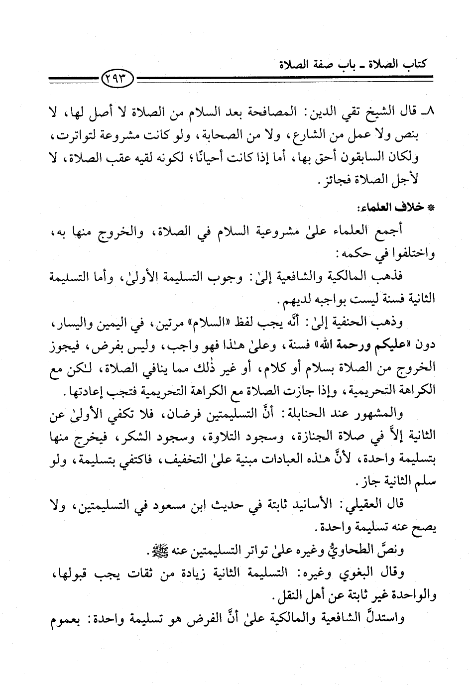 8 - قال الشيخ تقي الدين: المصافحة بعد السلام من الصلاة لا أصل لها، لا بنص ولا عمل من الشارع، ولا من الصحابة، ولو كانت مشروعة لتواترت، ولكان السابقون أحق بها، أما إذا كانت أحيانًا؛ لكونه لقيه عقب الصلاة، لا لأجل الصلاة فجائز.