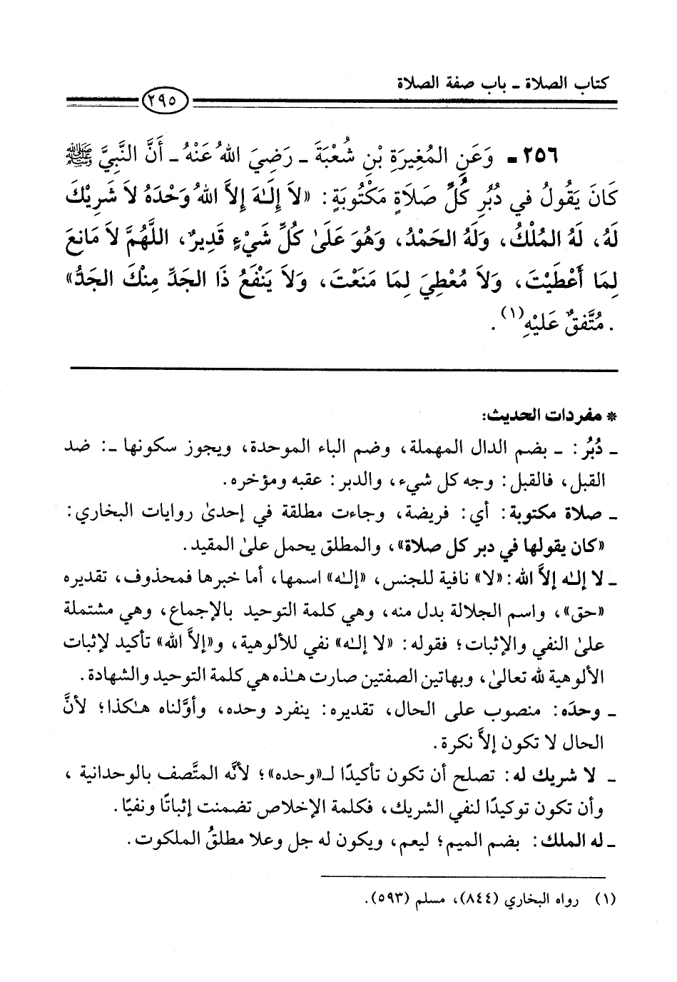 256 - وَعَنِ المُغِيرَةِ بْنِ شُعْبَةَ -رَضِيَ اللهُ عَنْهُ- أَنَّ النَّبِيَّ -صلى الله عليه وسلم- كَانَ يَقُولُ في دُبُرِ كُلِّ صَلاَةٍ مَكْتُوبَةٍ: "لاَ إِلَهَ إِلاَّ اللهُ وَحْدَهُ لاَ شَرِيْكَ لَهُ، لَهُ المُلْكُ، وَلَهُ الحَمْدُ، وَهُوَ عَلَى كُلِّ شَيْءٍ قَدِيرٌ، اللَّهُمَّ لاَ مَانِعَ لِمَا أعْطَيْتَ، وَلاَ مُعْطِيَ لِمَا مَنَعْتَ، وَلاَ يَنْفَعُ ذَا الجَدِّ مِنْكَ الجَدُّ". مُتَّفقُّ عَليْهِ (¬1).