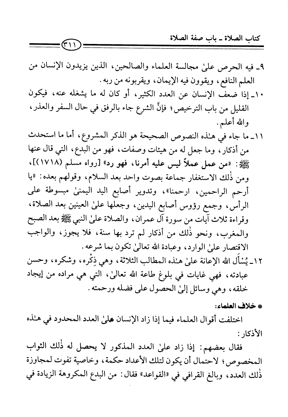 11 - ما جاء في هذه النصوص الصحيحة هو الذكر المشروع، أما ما استحدث من أذكار، وما جعل له من هيئات وصفات، فهو من البدع، التي قال عنها -صلى الله عليه وسلم-: "من عمل عملاً ليس عليه أمرنا، فهو رد" [رواه مسلم (1718)]، ومن ذلك الاستغفار جماعة بصوت واحد بعد السلام، وقولهم بعده: "يا أرحم الراحمين، ارحمنا"، وتدوير أصابع اليد اليمن مبسوطة على الرأس، وجمع رؤوس أصابع اليدين، وجعلها على العينين بعد الصلاة، وقراءة ثلاث آيات من سورة آل عمران، والصلاة على النبي -صلى الله عليه وسلم- بعد الصبح والمغرب، ونحو ذلك من أذكار لم ترد بها سنة، فلا يجوز، والواجب الاقتصار على الوارد، وعبادة الله تعالى تكون بما شرعه.