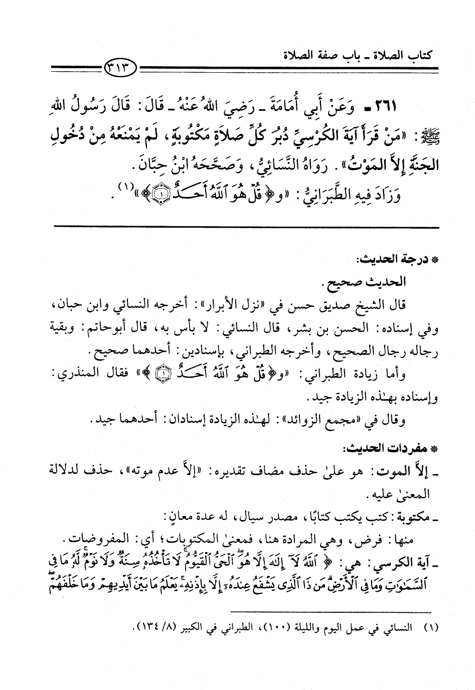 261 - وَعَنْ أَبِي أُمَامَةَ -رَضِيَ اللهُ عَنْهُ- قَالَ: قَالَ رَسُولُ اللهِ -صلى الله عليه وسلم-: "مَنْ قَرَأَ آيَةَ الكُرْسِيِّ دُبُرَ كُلِّ صَلاَةٍ مَكْتُوبَةٍ، لَمْ يَمْنَعْهُ مِنْ دُخُولِ الجَنَّةِ إلاَّ المَوْتُ". رَوَاهُ النَّسَائِيُّ، وَصَحَّحَهُ ابْنُ حِبَّانَ.
