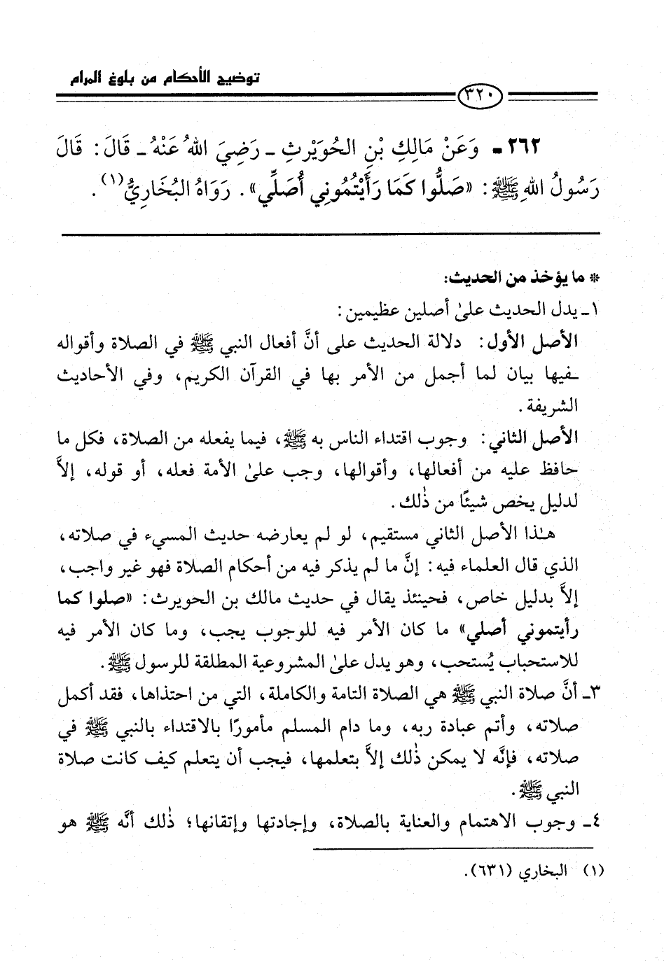 262 - وَعَنْ مَالِكِ بْنِ الحُوَيْرثِ -رَضِيَ اللهُ عَنْهُ- قَالَ: قَالَ رَسُولُ اللهِ -صلى الله عليه وسلم-:"صَلُّوا كَمَا رَأَيْتُمُونِي أُصَلِّي". رَوَاهُ البُخَارِيُّ (¬1).