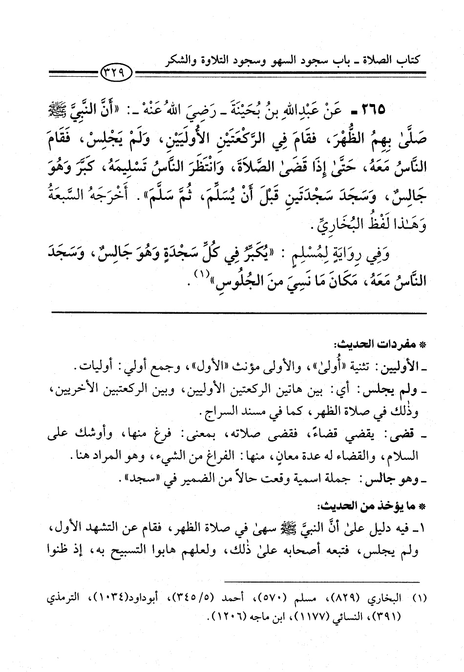265 - عَنْ عَبْدِ اللهِ بنُ بُحَيْنَةَ -رَضِيَ اللهُ عَنْه-: "أَنَّ النَّبِيَّ -صلى الله عليه وسلم- صَلَّى بِهِمُ الظُّهْرَ، فقَامَ فِي الرَّكْعَتَيْنِ الأُولَيَيْنِ، وَلَمْ يَجْلِسْ، فَقَامَ النَّاسُ مَعَهُ، حَتَّى إِذَا قَضَى الصَّلاَةَ، وَانْتَظَرَ النَّاسُ تَسْلِيمَهُ، كَبَّرَ وَهُوَ جَالِسٌ، وَسَجَدَ سَجْدَتَينِ قَبْلَ أَنْ يُسَلِّمَ، ثُمَّ سَلَّمَ". أَخْرَجَهُ السَّبعَةُ وَهَذا لَفْظُ البُخَارِيِّ.