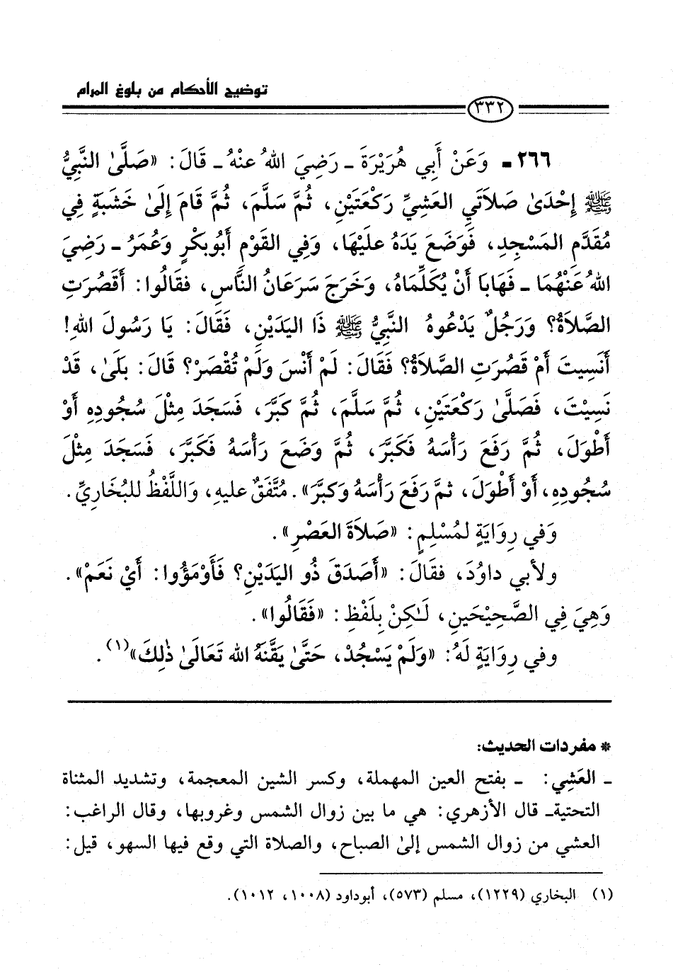 266 - وَعَنْ أَبِي هُرَيْرَةَ -رَضِيَ اللهُ عنْهُ- قَالَ: "صَلَّى النَّبِيُّ -صلى الله عليه وسلم- إِحْدَى صَلاَتَيِ العَشِيِّ رَكْعَتَيْنِ، ثُمَّ سَلَّمَ، ثُمَّ قَامَ إِلَى خَشَبهٍ فِي مُقَدَّمِ المَسْجِدِ، فَوَضَعَ يَدَهُ علَيْهَا، وَفِي القَوْمِ أبُو بكرٍ وَعُمَرُ -رَضِيَ اللهُ عَنْهُمَا- فَهَابَا أنْ يُكَلِّمَاهُ، وَخَرَجَ سَرَعَانُ النَّاسِ، فقَالُوا: أقَصُرَتِ الصَّلاَةُ؟ وَرَجُلٌ يَدْعُوهُ النَّبِيُّ -صلى الله عليه وسلم- ذَا اليَدَيْنِ، فَقَالَ: يَا رَسُولَ اللهِ! أَنَسِيتَ أَمْ قَصُرَتِ الصَّلاَةُ؟ فَقَالَ: لَمْ أنْسَ وَلَمْ تُقْصَرْ؟ قَالَ: بلَى، قَدْ نَسِيْتَ، فَصَلَّى رَكْعَتَيْنِ، ثُمَّ سَلَّمَ، ثُمَّ كَبَّرَ، فَسَجَدَ مِثْلَ سُجُودِهِ أوْ أَطْوَلَ، ثُمَّ رَفَعَ رَأْسَهُ فَكَبَّرَ، ثُمَّ وَضَعَ رَأسَهُ فَكَبَّرَ، فَسَجَدَ مِثْلَ سُجُودِهِ، أَوْ أَطْوَلَ، ثمَّ رَفَعَ رَأسَهُ وَكبَّرَ". مُتَّفَقٌ عليهِ، وَاللَّفْظُ للبُخَارِيِّ.
