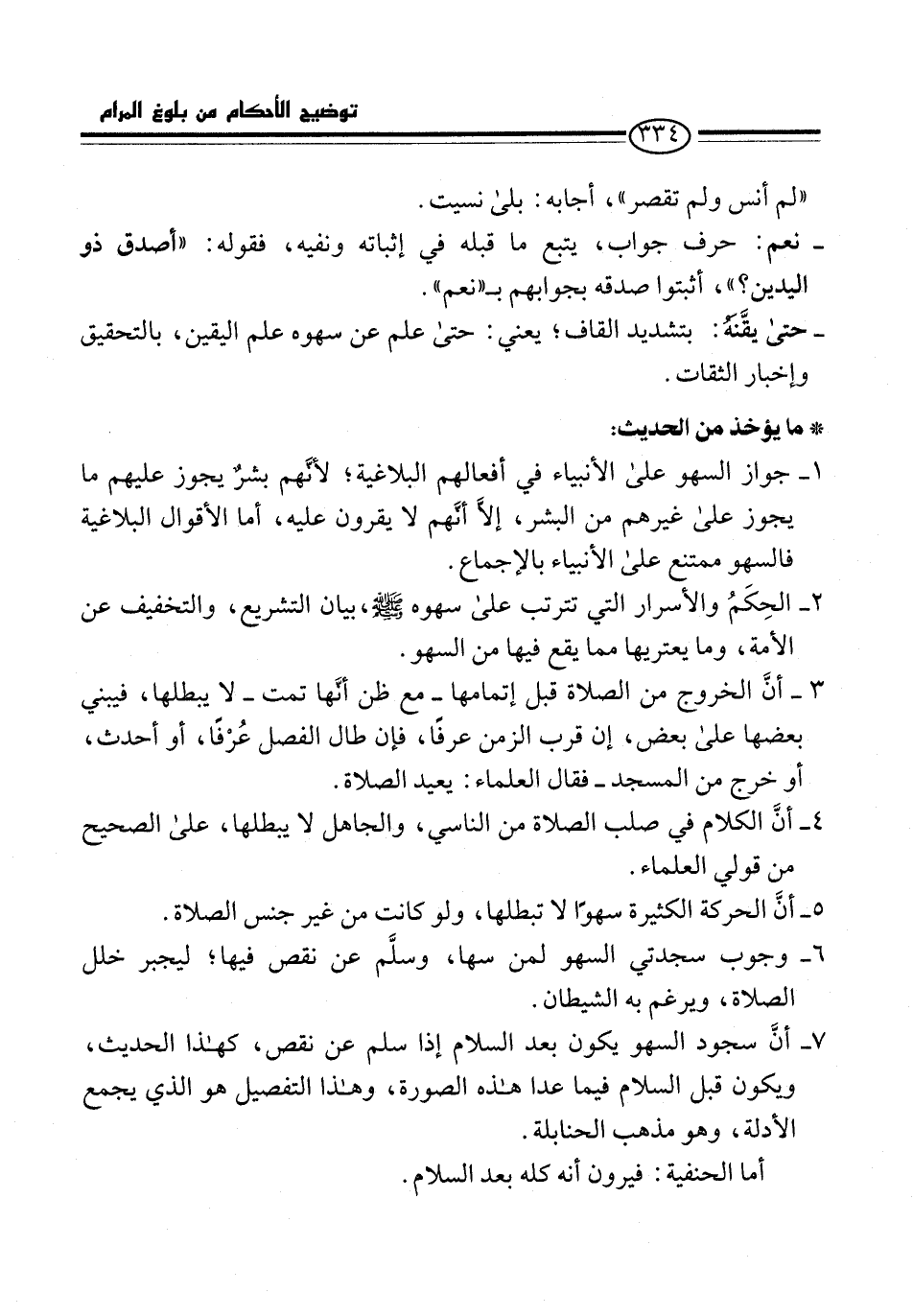 7 - أنَّ سجود السهو يكون بعد السلام إذا سلم عن نقص، كهذا الحديث، ويكون قبل السلام فيما عدا هذه الصورة، وهذا التفصيل هو الذي يجمع الأدلة، وهو مذهب الحنابلة.