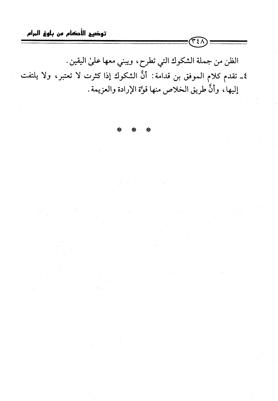 4 - تقدم كلام الموفق بن قدامة: أنَّ الشكوك إذا كثرت لا تعتبر، ولا يلتفت إليها، وأنَّ طريق الخلاص منها قوَّة الإرادة والعزيمة.