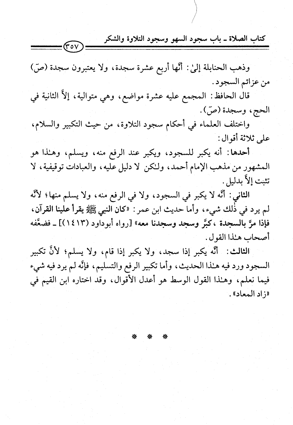 أحدها: أنه يكبر للسجود، ويكبر عند الرفع منه، ويسلم، وهذا هو المشهور من مذهب الإمام أحمد، ولكن لا دليل عليه، والعبادات توقيفية، لا تثبت إلاَّ بدليل.