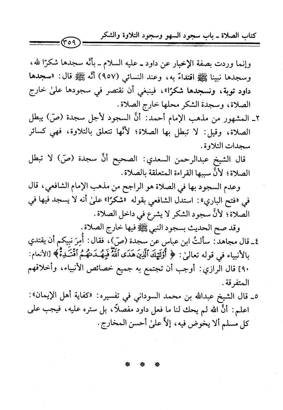 وإنما وردت بصفة الإخبار عن داود -عليه السلام- بأنَّه سجدها شكرًا لله، وسجدها نبينا -صلى الله عليه وسلم- اقتداءً به، وعند النسائي (957) أنَّه -صلى الله عليه وسلم- قال: "سجدها داود توبة، ونسجدها شكرًا"، فينبغي أن نقتصر في سجودها على خارج الصلاة، وسجدة الشكر محلها خارج الصلاة.