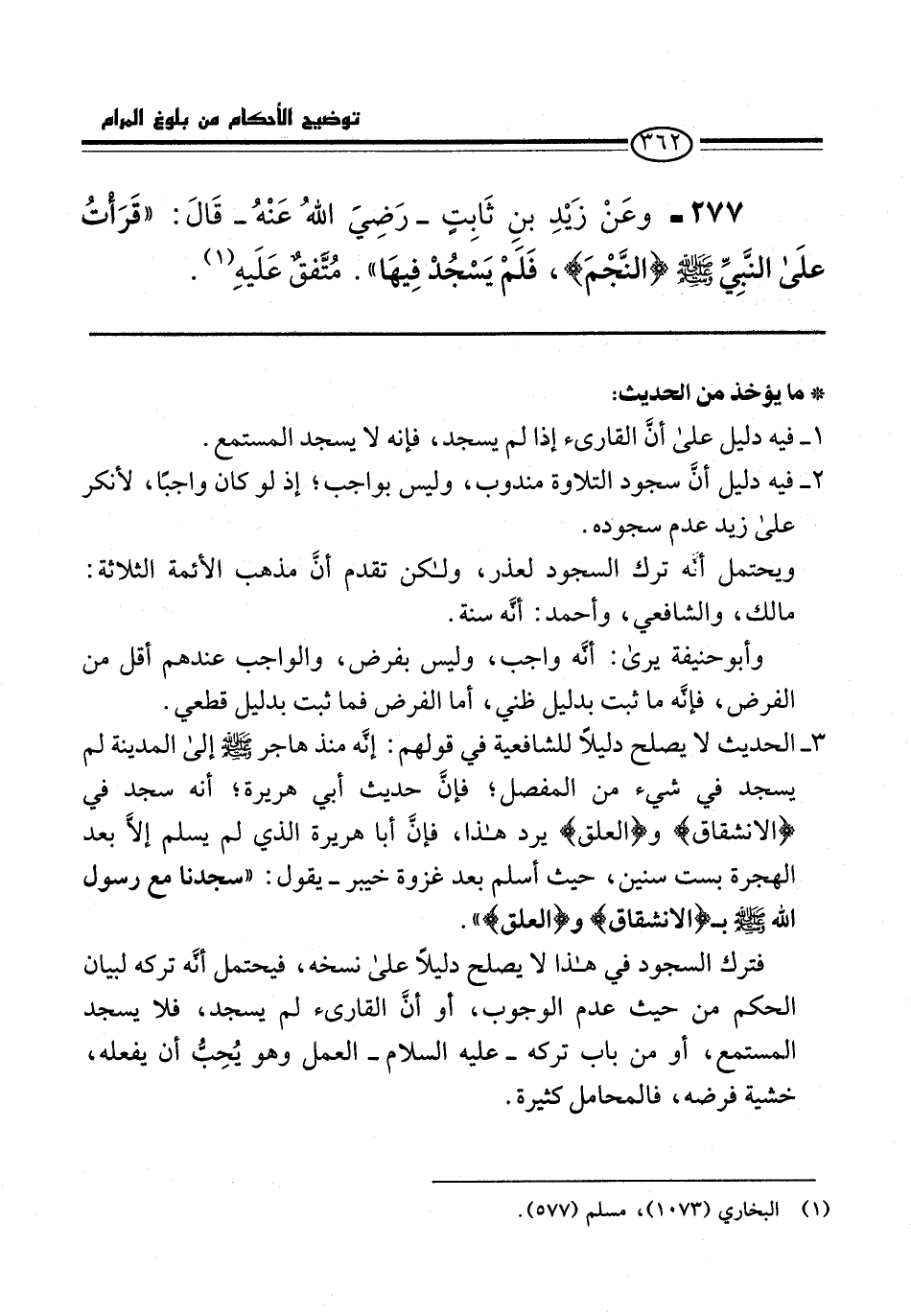 277 - وعَنْ زَيْدِ بنِ ثَابِتٍ -رَضِيَ اللهُ عَنْهُ- قَالَ: "قَرَأْتُ علَى النَّبِيِّ -صلى الله عليه وسلم- {النَّجْمَ}، فَلَمْ يَسْجُدْ فِيهَا". مُتَّفقٌ عَلَيهِ (¬1).