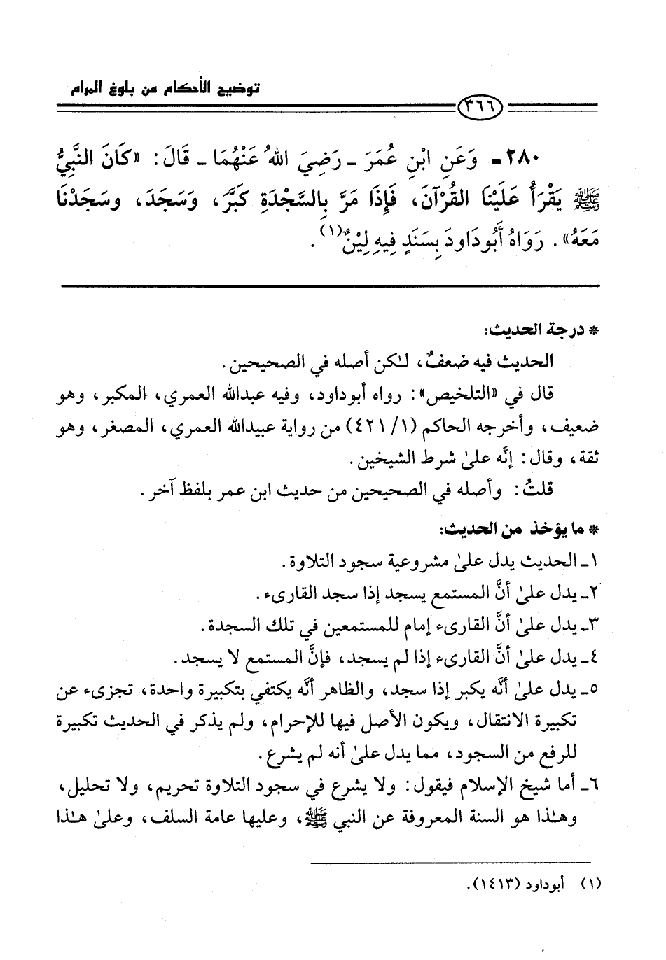 280 - وَعَنِ ابْنِ عُمَرَ -رَضِيَ اللهُ عَنْهُمَا- قَالَ: "كَانَ النَّبيُّ -صلى الله عليه وسلم- يَقْرأُ عَلَيْنَا القُرْآنَ، فَإِذَا مَرَّ بالسَّجْدَةِ كَبَّرَ، وَسَجَدَ، وسَجَدْنَا مَعَهُ". رَوَاهُ أَبُو دَاودَ بِسَنَدٍ فِيهِ لِيْنٌ (¬1).