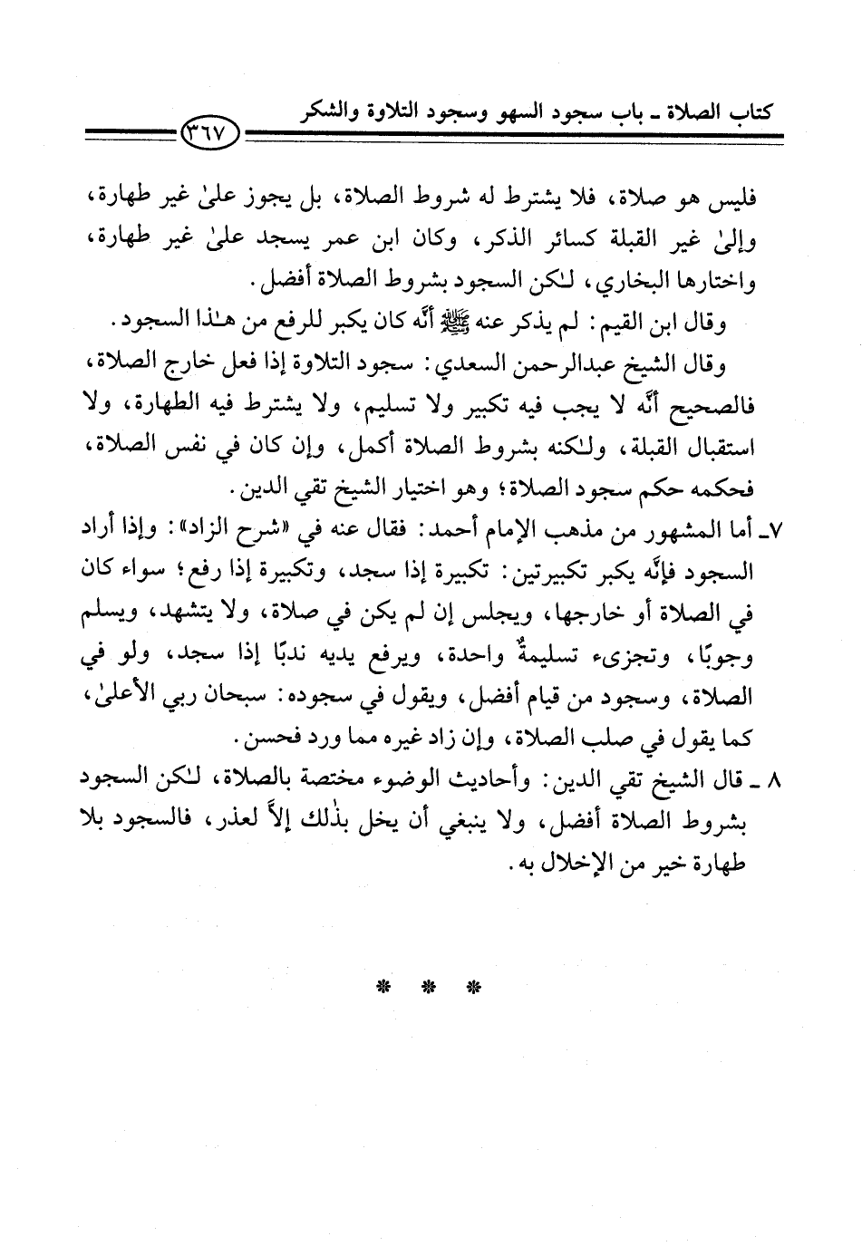 8 - قال الشيخ تقي الدين: وأحاديث الوضوء مختصة بالصلاة، لكن السجود بشروط الصلاة أفضل، ولا ينبغي أن يخل بذلك إلاَّ لعذر، فالسجود بلا طهارة خير من الإخلال به.