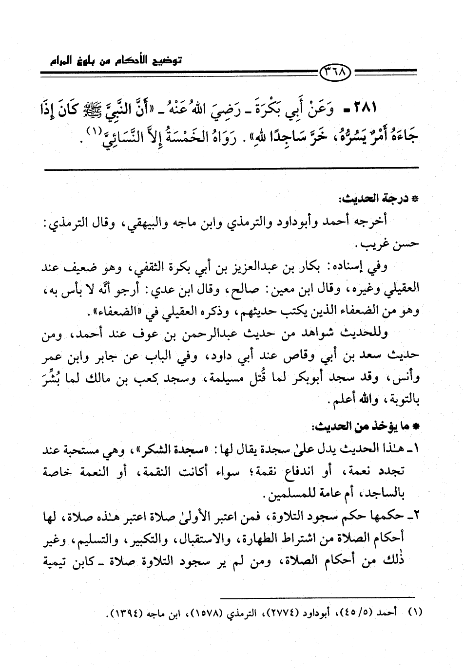 281 - وَعَنْ أَبِي بَكْرَةَ -رَضِيَ اللهُ عَنْهُ- "أنَّ النَّبِيَّ -صلى الله عليه وسلم- كانَ إِذَا جَاءَهُ أمرٌ يَسُرُّهُ، خَرَّ سَاجِدًا للهِ". رَوَاهُ الخَمْسَةُ إِلاَّ النَّسَائيَّ (¬1).