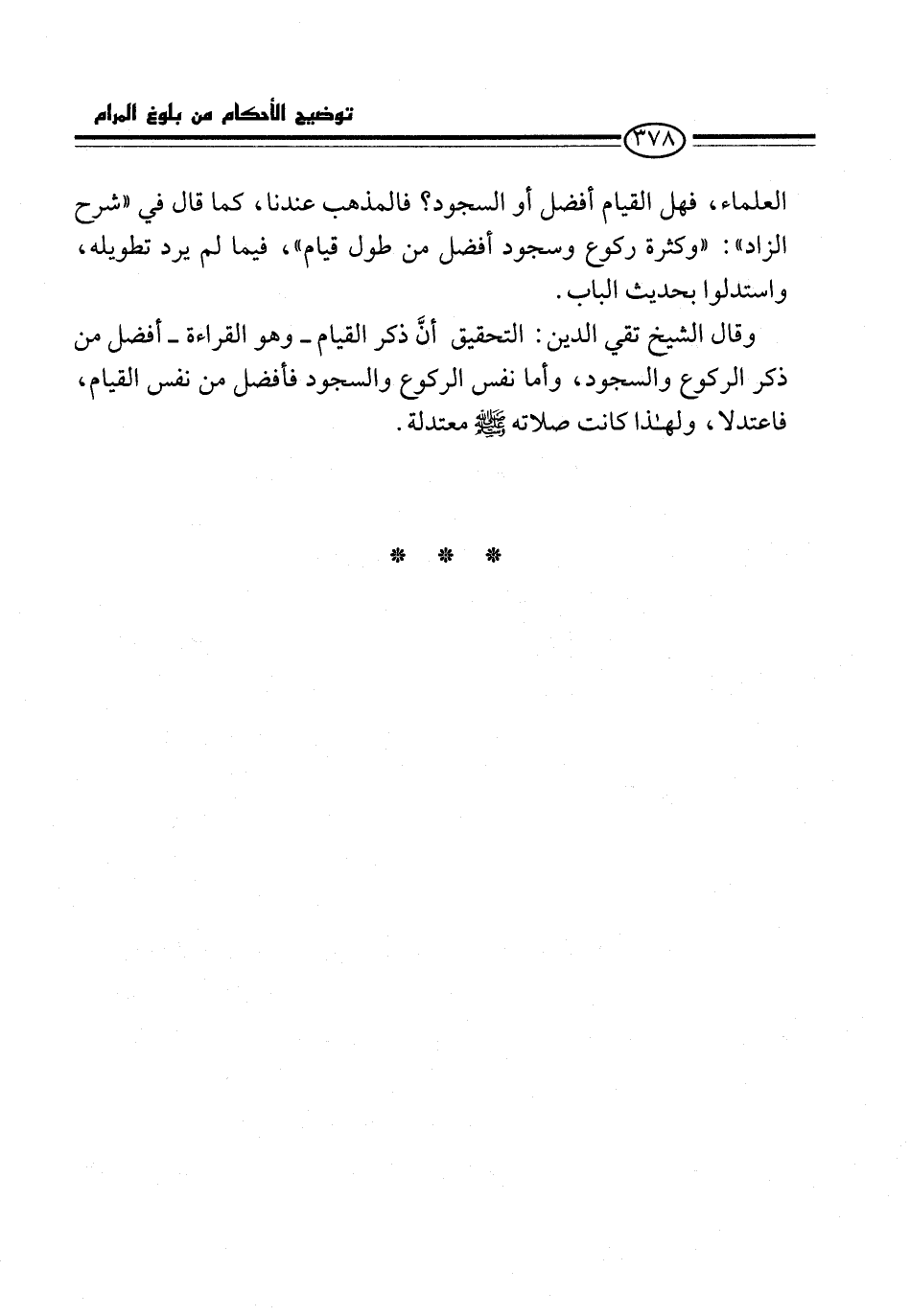 وقال الشيخ تقي الدين: التحقيق أنَّ ذكر القيام -وهو القراءة- أفضل من ذكر الركوع والسجود، وأما نفس الركوع والسجود فأفضل من نفس القيام، فاعتدلا، ولهذا كانت صلاته -صلى الله عليه وسلم- معتدلة.