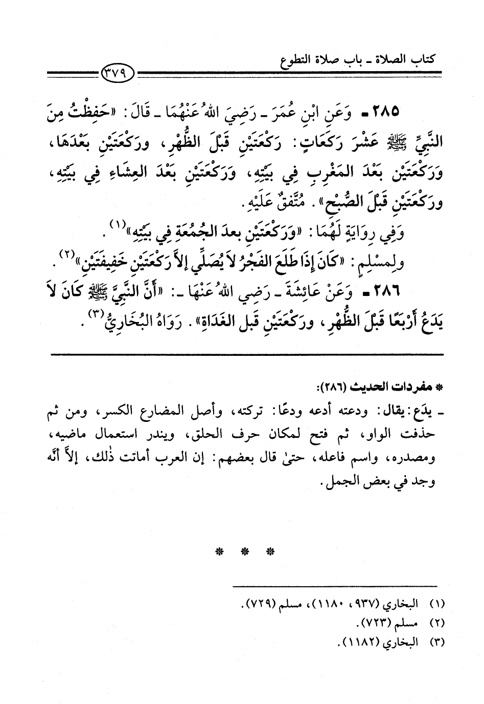 285 - وَعَنِ ابْنِ عُمَرَ -رَضِيَ اللهُ عَنْهُمَا- قَالَ: "حَفِظْتُ مِنَ النَّبِيِّ -صلى الله عليه وسلم- عَشْرَ رَكَعَاتٍ: رَكْعَتَيْنِ قَبْلَ الظُّهْرِ، ورَكعَتَيْنِ بَعْدَهَا، وَرَكعَتَيْن بَعْدَ المَغْرِبِ فِي بيْتِهِ، وَرَكْعَتَيْنِ بَعْدَ العِشَاءِ فِي بيْتِهِ، ورَكْعَتَيْنِ قَبْلَ الصُّبْحِ". مُتَّفقٌ عَلَيْهِ.