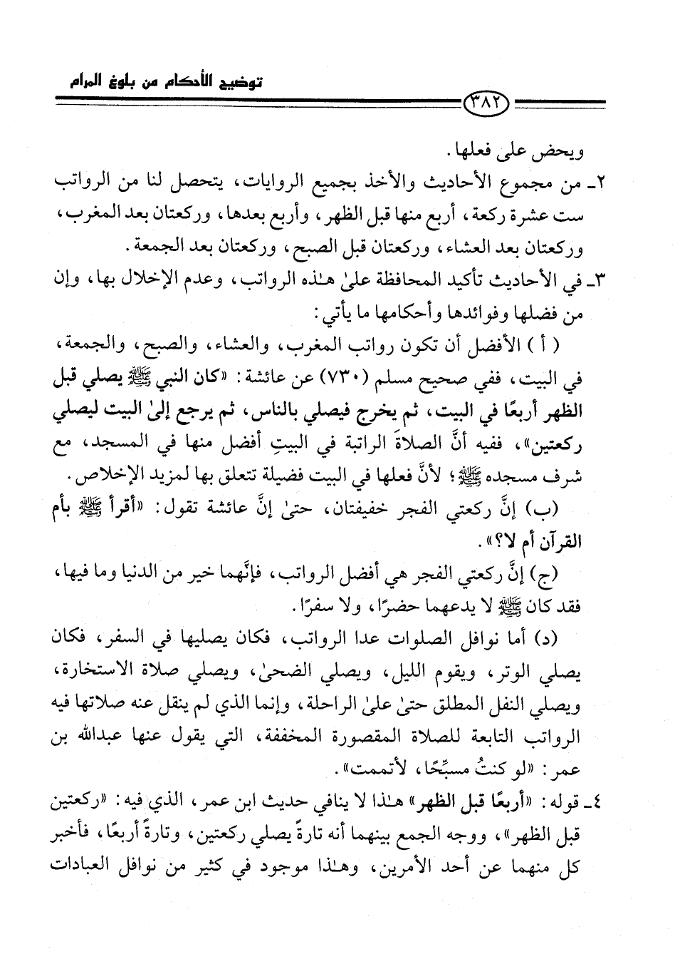 2 - من مجموع الأحاديث والأخذ بجميع الروايات، يتحصل لنا من الرواتب ست عشرة ركعة، أربع منها قبل الظهر، وأربع بعدها، وركعتان بعد المغرب، وركعتان بعد العشاء، وركعتان قبل الصبح، وركعتان بعد الجمعة.