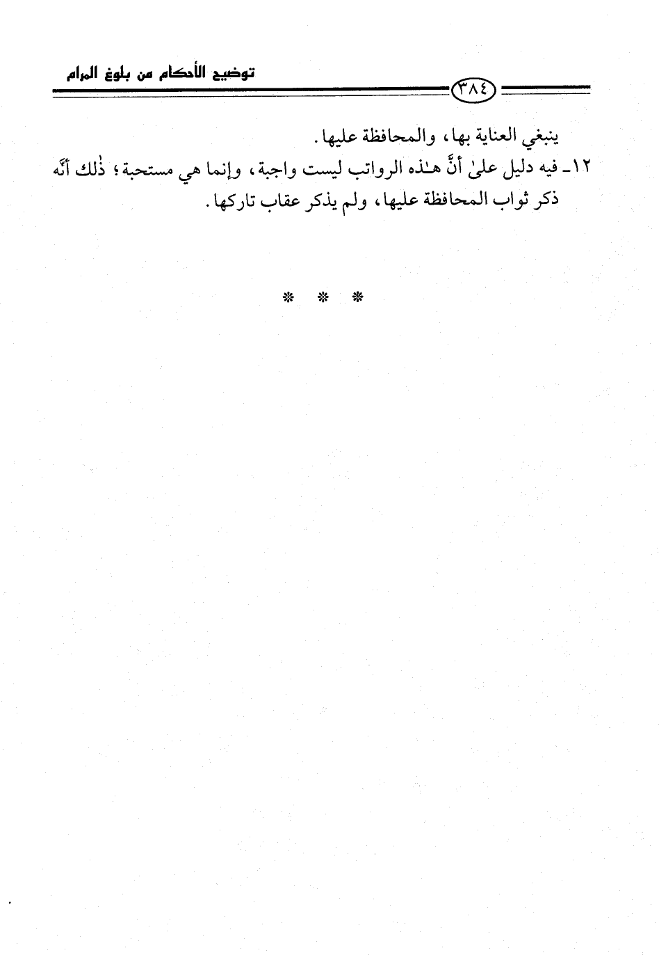 12 - فيه دليل على أنَّ هذه الرواتب ليست واجبة، وإنما هي مستحبة؛ ذلك أنَّه ذكر ثواب المحافظة عليها، ولم يذكر عقاب تاركها.