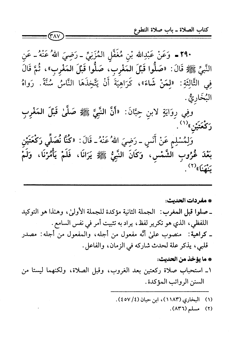 290 - وَعَنْ عَبْدِ الله بْنِ مُغَفَّلٍ المُزَنِيِّ -رَضِيَ اللهُ عَنْهُ- عَنِ النَّبيِّ -صلى الله عليه وسلم- قَالَ: "صَلُّوا قَبْلَ المَغْرِبِ، صَلُّوا قَبْلَ المَغْرِبِ"، ثُمَّ قَالَ فِي الثَّالِثَةِ: "لِمَنْ شَاءَ"، كَرَاهِيَةَ أَنْ يتَّخِذَهَا النَّاسُ سُنَّةً. رَواهُ البُخَارِيُّ.