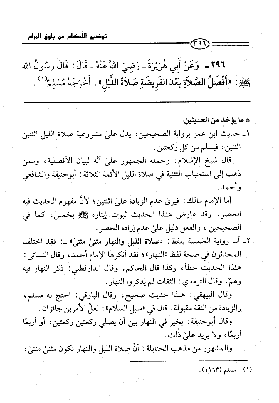 296 - وَعَنْ أَبي هُرَيْرَةَ -رَضِيَ اللهُ عَنْهُ- قَالَ: قَالَ رسُولُ الله -صلى الله عليه وسلم-: "أفْضَلُ الصَّلاَةِ بَعْدَ الفَرِيضَةِ صَلاةُ اللَّيْلِ". أَخْرَجَهُ مُسْلِمٌ (¬1).