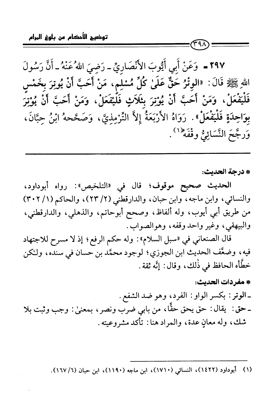 297 - وَعَنْ أَبِي أَيُّوبَ الأنْصَارِيِّ -رَضِيَ اللهُ عَنْهُ- أَنَّ رَسُولَ اللهِ -صلى الله عليه وسلم- قالَ: "الوِتْرُ حَقٌّ عَلَى كُلِّ مُسْلِمٍ، مَنْ أحَبَّ أنْ يُوتِرَ بِخَمْسٍ فَلْيفْعَلْ، وَمَنْ أحَبَّ أنْ يُؤْترَ بِثَلاَثٍ فَليْفَعَلْ، وَمَنْ أحَبَّ أنْ يُوْترَ بِوَاحِدَةٍ فَلْيفْعَلْ". رَوَاهُ الأرْبَعَةُ إِلاَّ التِّرْمِذِيَّ، وَصَحَّحهُ ابْنُ حبَّانَ، وَرجَّحَ النَّسَائِيُّ وقْفَهُ (¬1).