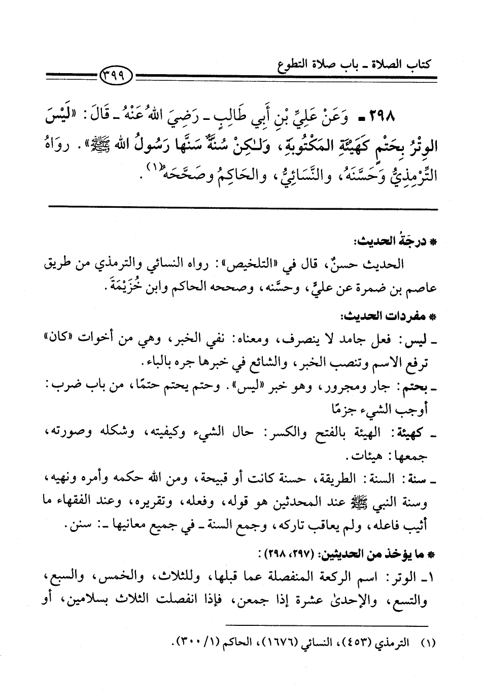 298 - وَعَنْ عَلِيِّ بْنِ أَبِي طَالِبٍ -رَضِيَ اللهُ عَنْهُ- قَالَ: "لَيْسَ الوِتْرُ بِحَتْمٍ كهَيئَةِ المَكْتُوبةِ، وَلكِنْ سُنَّةٌ سَنَّها رَسُولُ الله -صلى الله عليه وسلم-". روَاهُ التِّرْمِذِيُّ وَحسَّنَهُ، والنَّسَائِيُّ، والحَاكِم وصَحَّحَهُ (¬1).