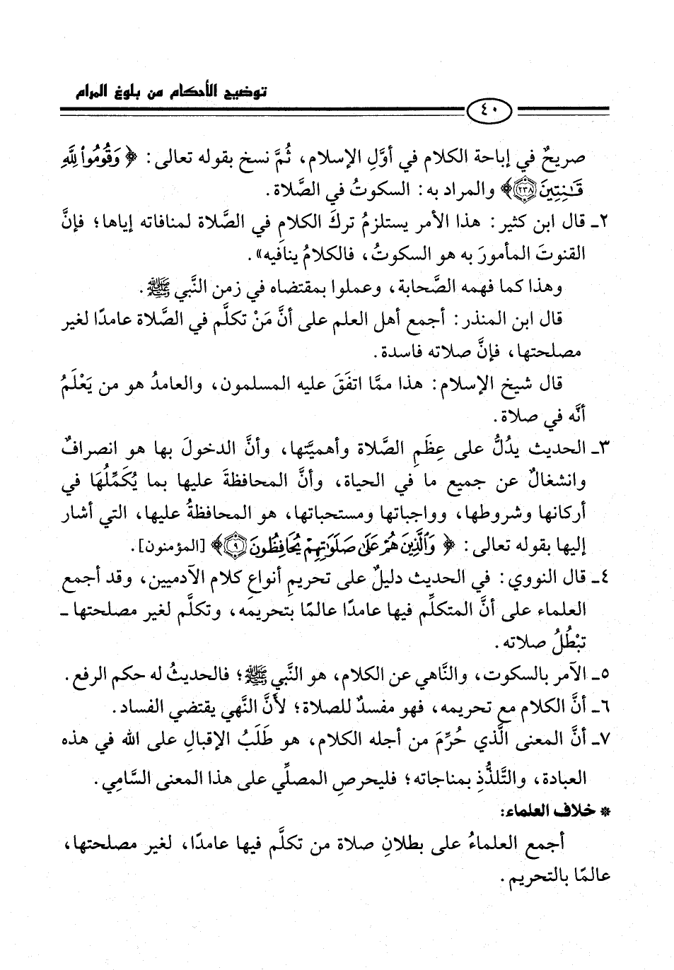 7 - أنَّ المعنى الذي حُرَّمَ من أجله الكلام، هو طَلَبُ الإقبالِ على الله في هذه العبادة، والتَّلذُّذِ بمناجاته؛ فليحرصِ المصلِّي على هذا المعنى السَّامِي.