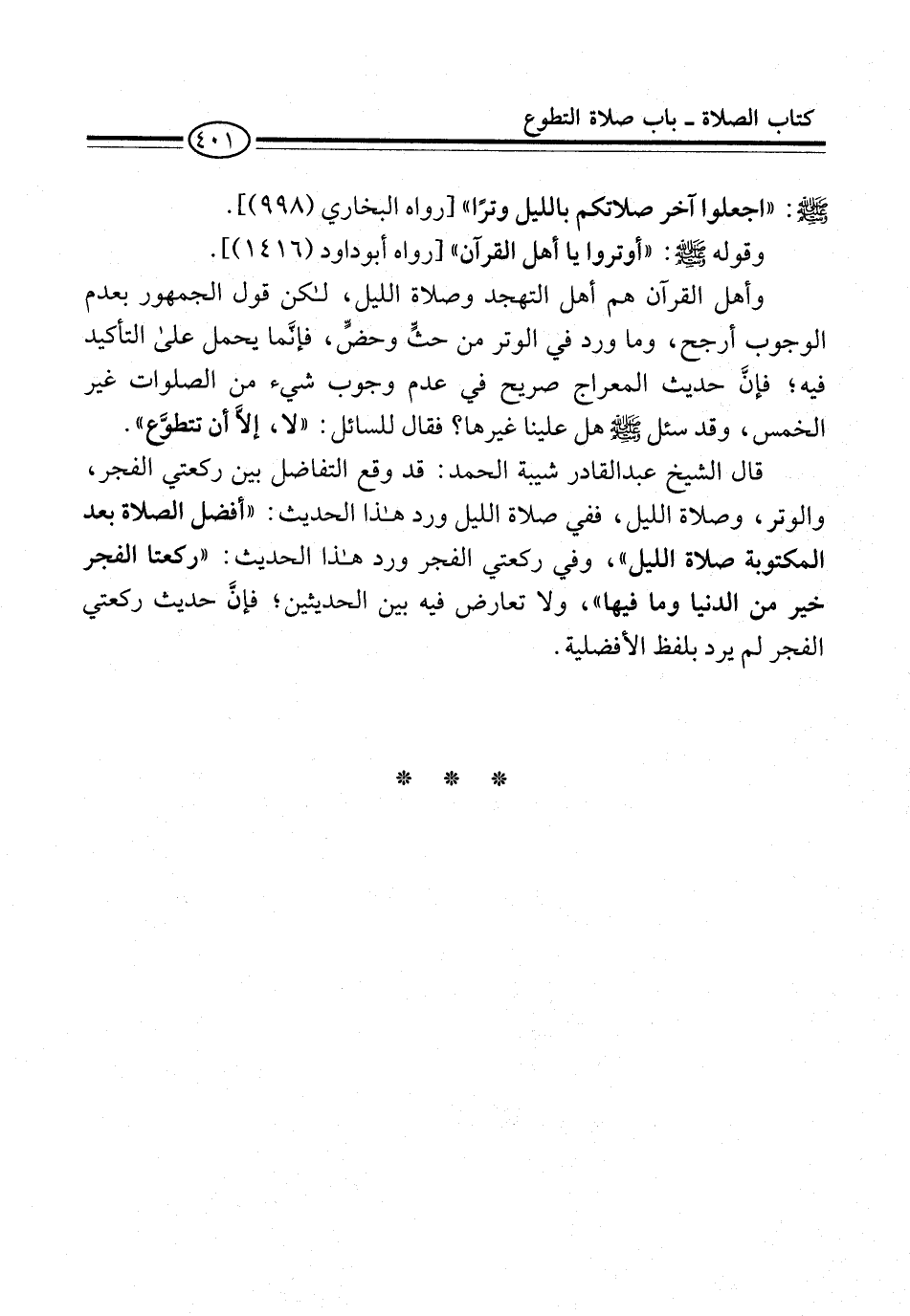 قال الشيخ عبد القادر شيبة الحمد: قد وقع التفاضل بين ركعتي الفجر، والوتر، وصلاة الليل، ففي صلاة الليل ورد هذا الحديث: "أفضل الصلاة بعد المكتوبة صلاة الليل"، وفي ركعتي الفجر ورد هذا الحديث: "ركعتا الفجر خير من الدنيا وما فيها"، ولا تعارض فيه بين الحديثين؛ فإنَّ حديث ركعتي الفجر لم يرد بلفظ الأفضلية.