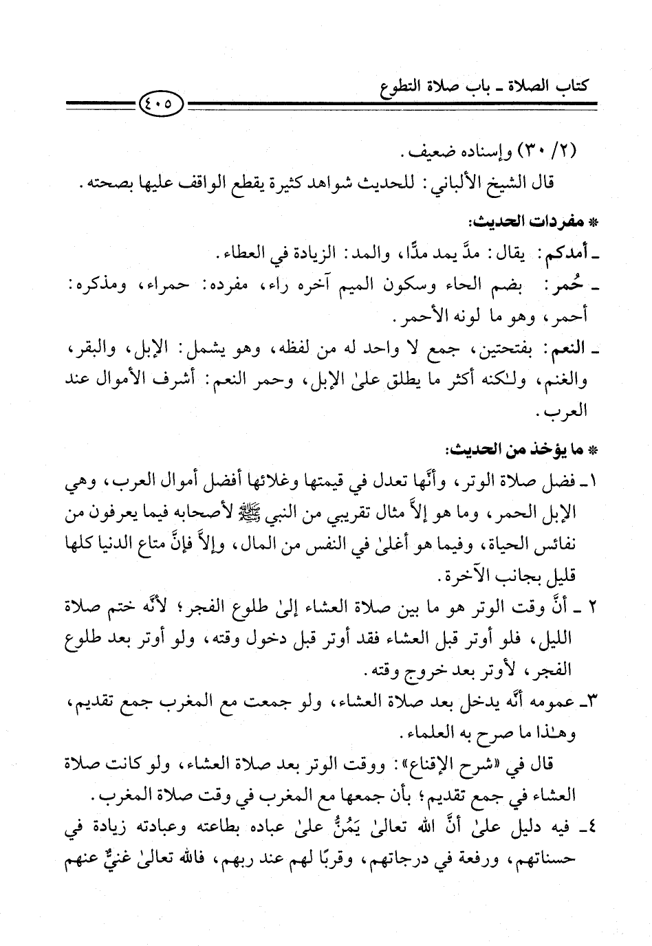 1 - فضل صلاة الوتر، وأنَّها تعدل في قيمتها وغلائها أفضل أموال العرب، وهي الإبل الحمر، وما هو إلاَّ مثال تقريبي من النبي -صلى الله عليه وسلم- لأصحابه فيما يعرفون من نفائس الحياة، وفيما هو أغلى في النفس من المال، وإلاَّ فإنَّ متاع الدنيا كلها قليل بجانب الآخرة.