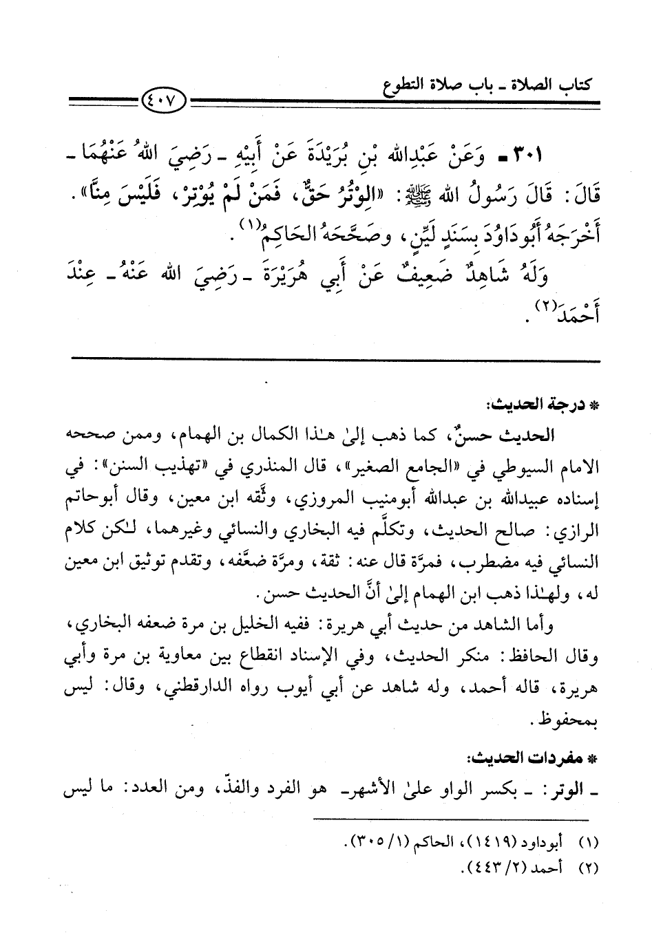 301 - وَعَنْ عَبْدِ الله بْنِ بُرَيْدَةَ عَنْ أَبِيْهِ -رَضِيَ اللهُ عَنْهُمَا- قَالَ: قَالَ رَسُولُ الله -صلى الله عليه وسلم-: "الِوْتُرُ حَقٌّ، فَمَنْ لَمْ يُوْتِرْ، فَلَيْسَ مِنَّا". أَخْرَجَهُ أَبُو دَاوُدَ بِسَنَدٍ لَيِّنٍ، وصَحَّحَهُ الحَاكِم (¬1).