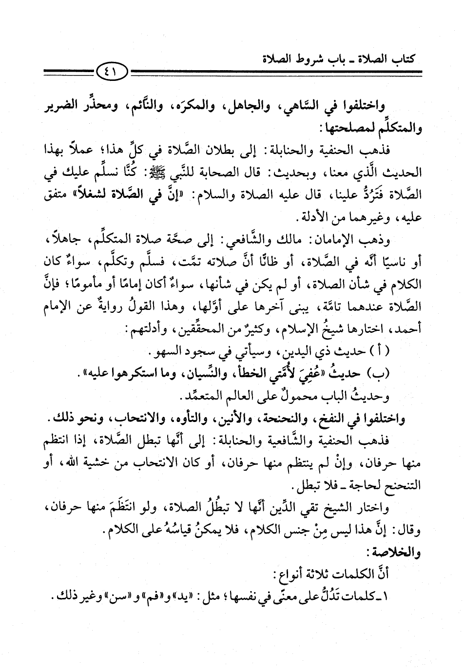 فذهب الحنفية والحنابلة: إلى بطلان الصَّلاة في كلِّ هذا؛ عملاً بهذا الحديث الَّذي معنا، وبحديث: قال الصحابة للنَّبي -صلى الله عليه وسلم-: كُنَّا نسلِّم عليك في الصَّلاة فترُدُّ علينا، قال عليه الصلاة والسلام: "إنَّ في الصَّلاة لشغلاً" متفق عليه، وغيرهما من الأدلة.