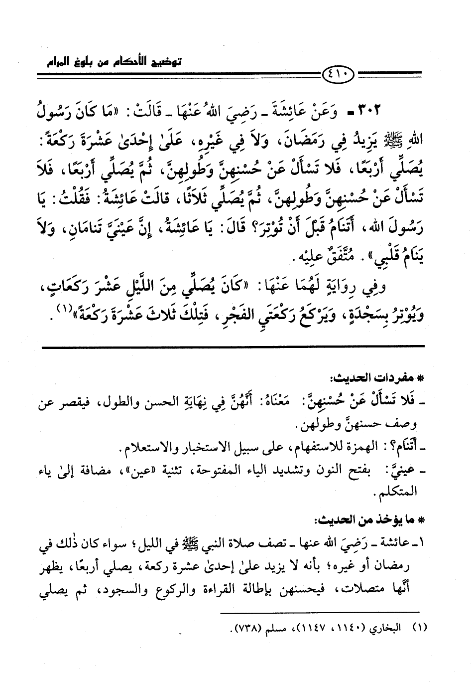 302 - وَعَنْ عَائِشَةَ -رَضِيَ اللهُ عَنْهَا- قَالَتْ: "مَا كَانَ رَسُولُ اللهِ -صلى الله عليه وسلم- يَزِيدُ فِي رَمَضَانَ، وَلاَ فِي غَيْرِهِ، عَلَى إِحْدَى عَشْرَةَ رَكْعَةً: يُصَلِّي أَرْبَعًا، فَلا تَسْأَلْ عَنْ حُسْنهِنَّ وَطُولِهِنَّ، ثُمَّ يُصَلِّي أَرْبَعًا، فَلاَ تَسْأَلْ عَنْ حُسْنهِنَّ وَطُولِهنَّ، ثُمَّ يُصَلِّي ثَلاَثًا، قالَتْ عَائشِةُ: فَقُلْتُ: يَا رَسُولَ الله، أَتَنَامُ قَبْلَ أَنْ تُوْتِر؟ قَالَ: يَا عَائشِةُ، إِنَّ عَيْنَيَّ تَنامَانِ، وَلاَ يَنَامُ قَلْبِي". مُتَّفَقٌ علِيْه.