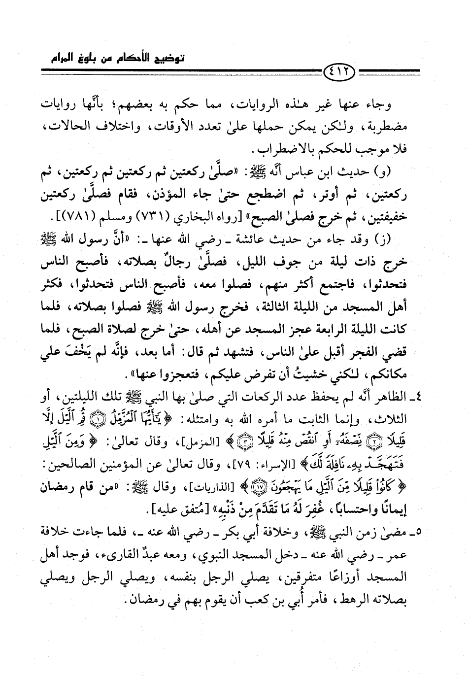 (ز) وقد جاء من حديث عائشة -رضي الله عنها-: "أنَّ رسول الله -صلى الله عليه وسلم- خرج ذات ليلة من جوف الليل، فصلَّى رجالٌ بصلاته، فأصبح الناس فتحدثوا، فاجتمع أكثر منهم، فصلوا معه، فأصبح الناس فتحدثوا، فكثر أهل المسجد من الليلة الثالثة، فخرج رسول الله -صلى الله عليه وسلم- فصلوا بصلاته، فلما كانت الليلة الرابعة عجز المسجد عن أهله، حتى خرج لصلاة الصبح، فلما قضي الفجر أقبل على الناس، فتشهد ثم قال: أما بعد، فإنَّه لم يَخْفَ علي مكانكم، لكني خشيتُ أن تفرض عليكم، فتعجزوا عنها".